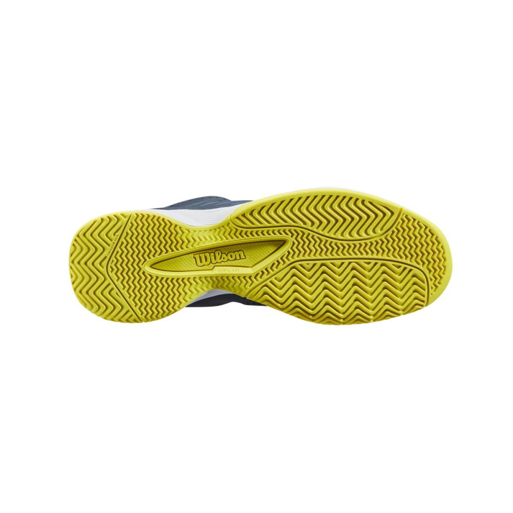 Juniorská tenisová obuv Wilson Kaos QL Omphalodes v tmavě modré barvě se zlatavě žlutou podrážkou se stane nejlepším parťákem mladých tenisových nadějí. Bota je pohodlná a spolehlivě tlumí nárazy. Obuv poskytne lepší stabilitu a je vhodná na všechny tenisové povrchy. Integrované šněrování Quick Lace je pohodlné, rychlé a pevné.